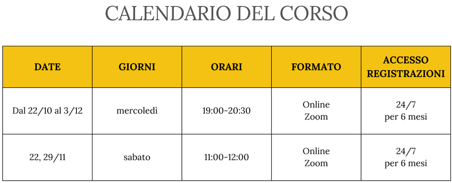 Le lezioni si terranno ogni mercoledì, dal 22 ottobre al 3 dicembre, dalle 19:00 alle 20:30 (ora